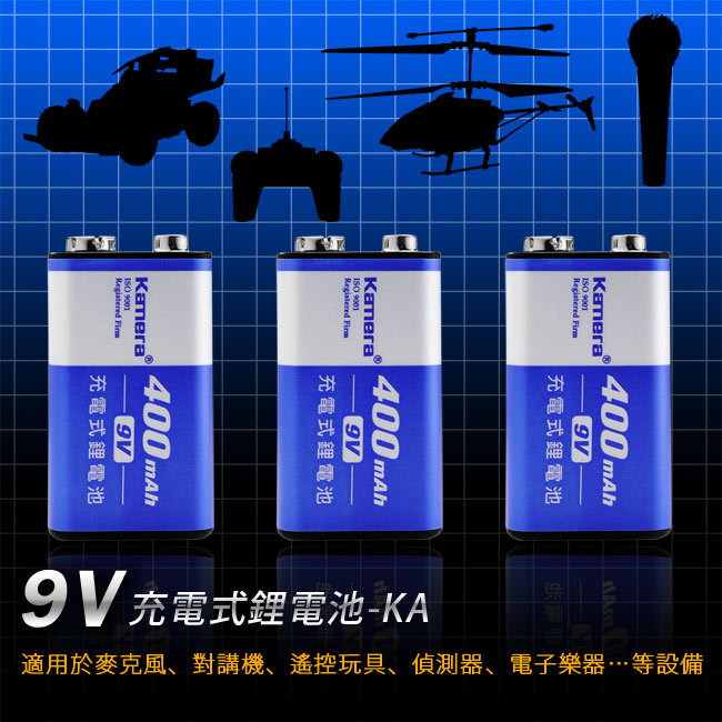 Kamera 9V 充電式鋰電池可重複充電,讓電池可長久使用,相當環保又經濟;搭載400mAh大容量能讓設備電力更持續,是充電式鋰電池的好選擇。