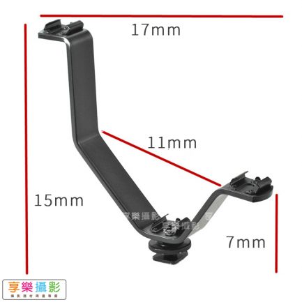 1、三合一金屬熱靴V型支架,包含3個熱靴口,可用於轉接熱靴接口的麥克風、閃光燈、LED攝像燈等