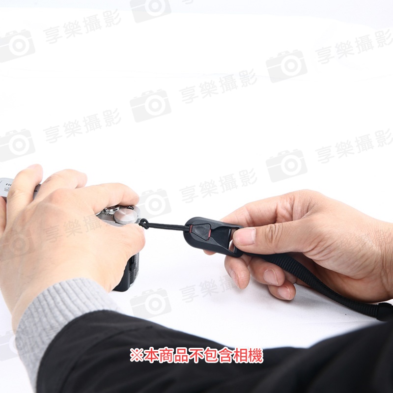 使用時只需將手腕帶固定於扣環,再將安全扣固定於相機,即可快速拆卸相機背帶