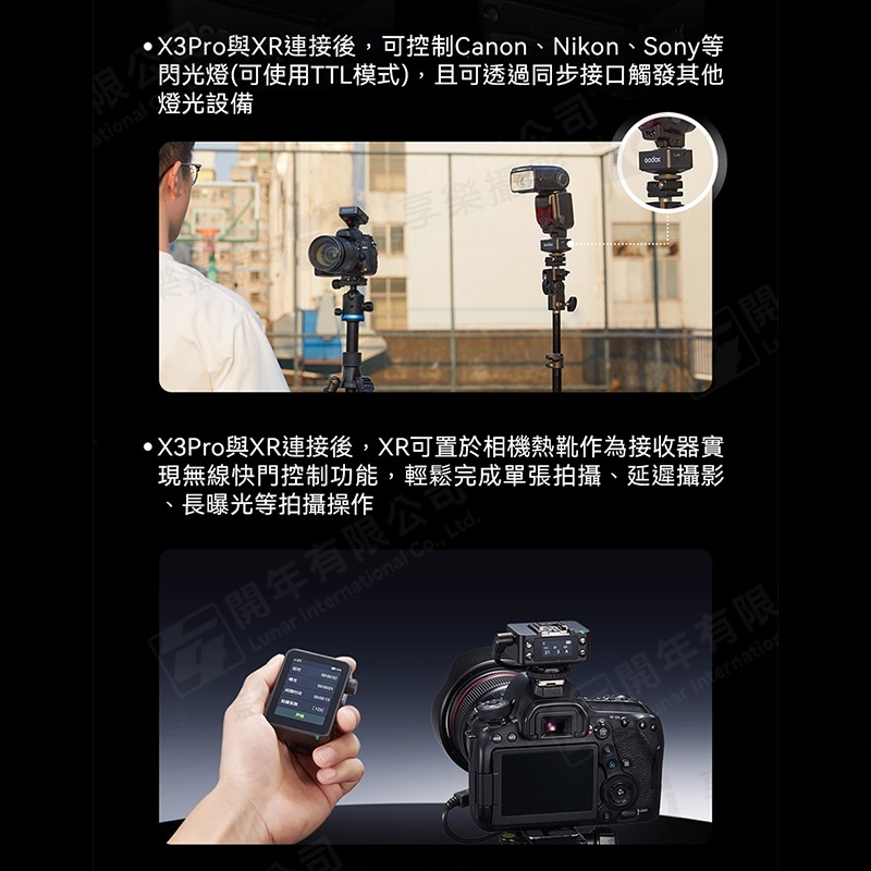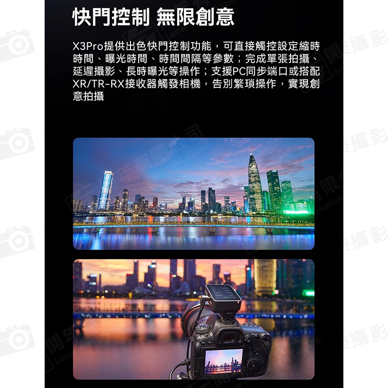 可直接觸控設定縮時、曝光、間隔等參數,並支援PC同步端口或搭配XR/TR-RX接收器觸發相機