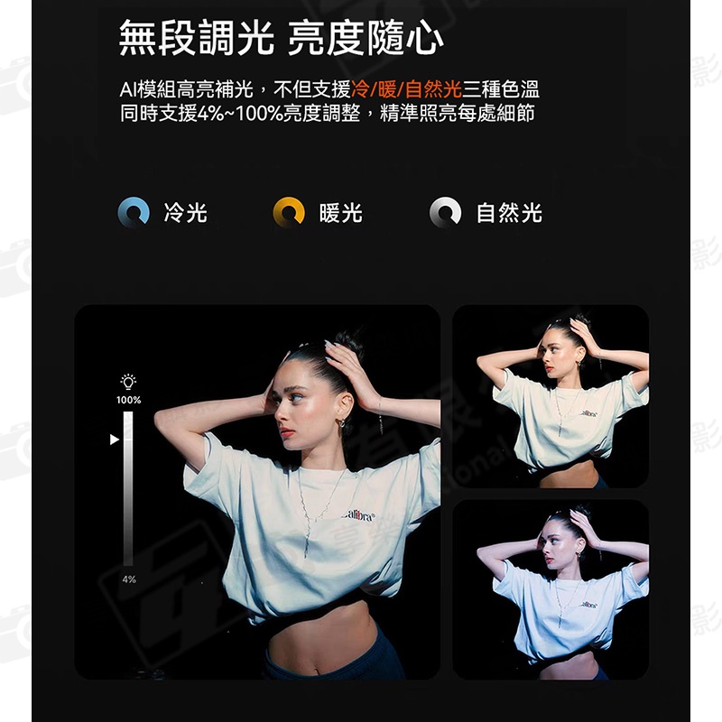 AI模組高亮補光,不但支援冷/暖/自然光三種色溫,同時支援4%~100%亮度調整,精準照亮每處細節