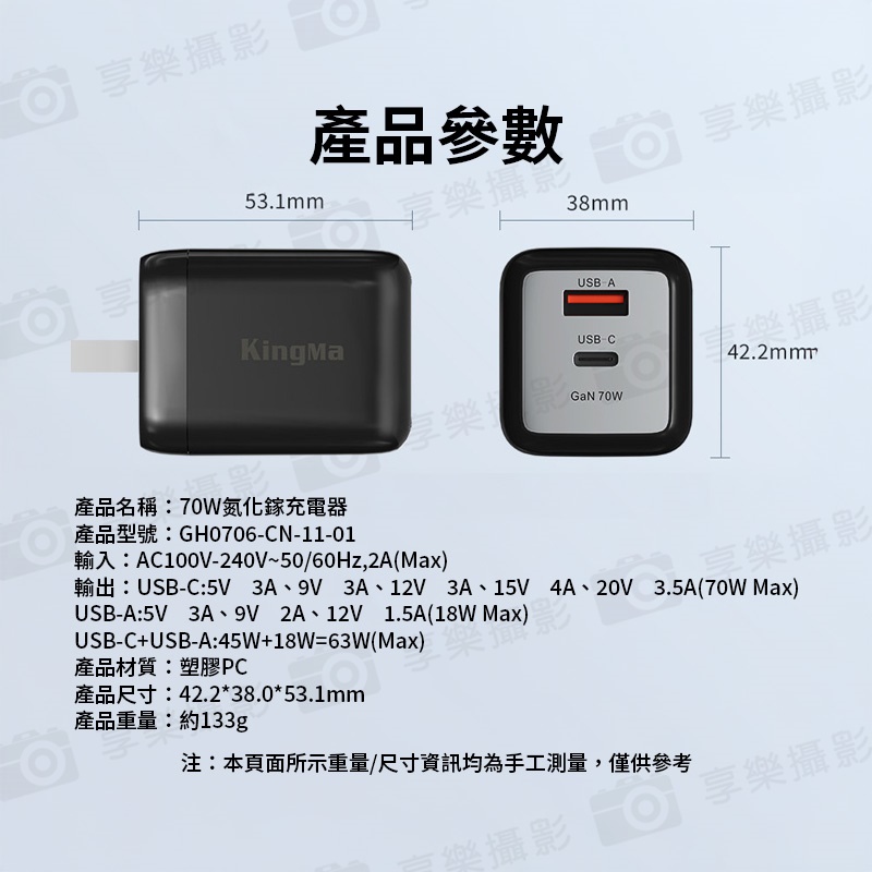 輸出:USB-C:5V⎓3A、9V⎓3A、12V⎓3A、15V⎓4A、20V⎓3.5A(70W Max)