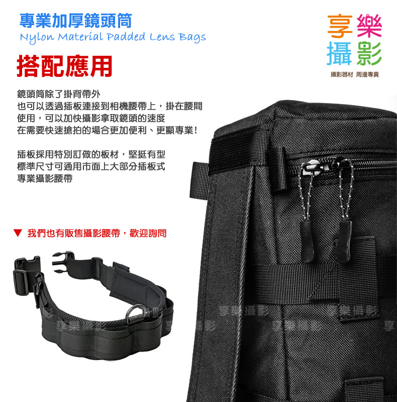 可另加購攝影腰帶,將鏡頭筒外掛於上面,方便從腰間拿取替換鏡頭