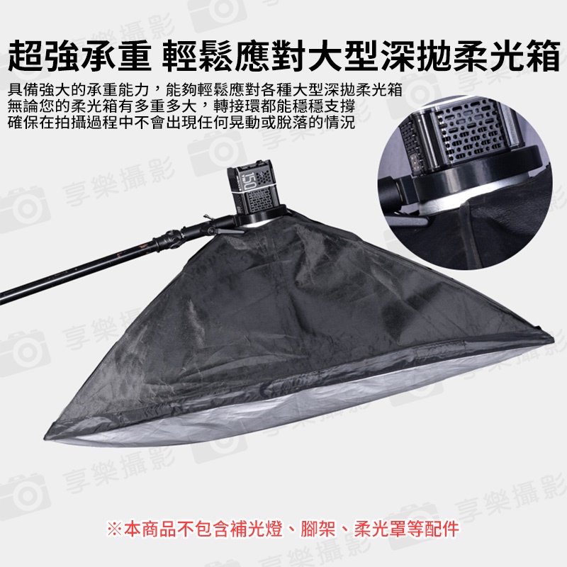 具備強大的承重能力,能夠輕鬆應對各種大型深拋柔光箱,無論您的柔光箱有多重多大,轉接環都能穩穩支撐,確保在拍攝過程中不會出現任何晃動或脫落的情況
