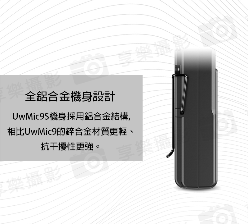 UwMic9S是一款UHF無線麥克風系統,為影片Podcast,新聞制作人,影片創作者等人群提供專業的音頻解決方案。UwMic9S還支援外接直流電5V行動電源充電,實現錄音過程不間斷。