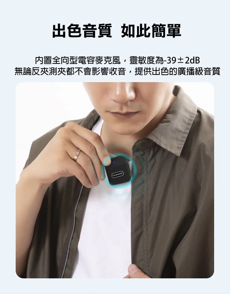 TX發射器內置全向型電容麥克風,能夠提供廣播級清晰的音質效果;