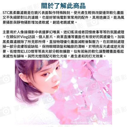 STC黑柔霧濾鏡是在鏡片表面製作特殊蝕刻,使光產生輕微改變達到軟化畫面又不失細節對比的濾鏡,也是好萊塢電影業常用的配件,其用途廣泛,能為風景攝影與靜物攝影增加柔軟感,創造老鏡感覺。