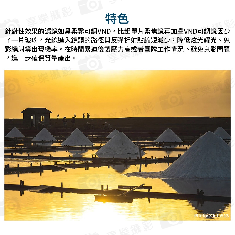 針對性效果的濾鏡如黑柔霧可調VND,比起單片柔焦鏡再加疊VND可調鏡因少了一片玻璃,光線進入鏡頭的路徑與反彈折射點縮短減少,降低炫光耀光、鬼影繞射等出現機率。在時間緊迫後製壓力高或者團隊工作情況下避免鬼影問題,進一步確保質量產出。