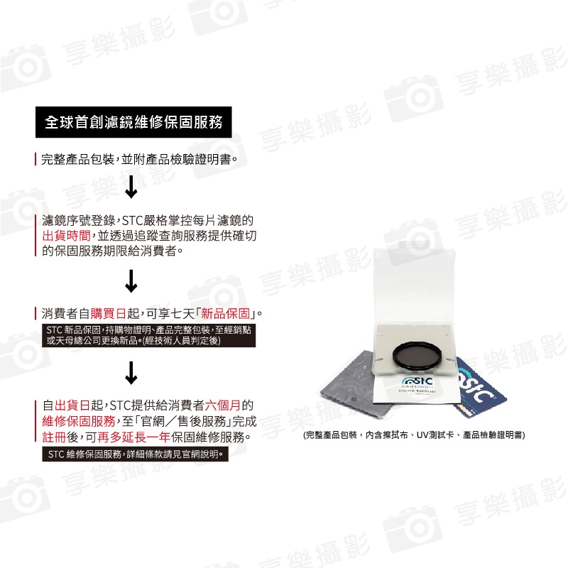 由光柵原理而構成的偏光片本身就會降低曝光值,STC 選用頂級高透光的偏光片與SLC模擬線性光譜校正的鍍模技術,使得曝光值僅減低1EV,並且讓影像呈現超低色偏的極佳畫質。STC鏡片的品質以最嚴謹的精拋規範20/40μm與3個牛頓環來達到最完美的成像,並且無60μm以上的亮點與雜質,在高畫素數位相機時代的潮流下,STC偏光鏡能禁得起最嚴峻的挑戰。