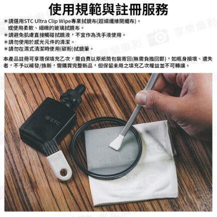 *請選用STC Ultra Clip Wipe專業拭鏡布(超細纖維開纖布)。或使用柔軟、細緻的玻璃拭鏡布。