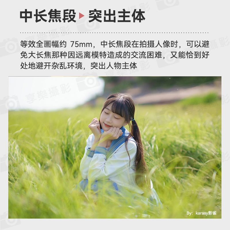等效全畫幅約75mm,中長焦段在拍攝人像時,可以避免大長焦那種因遠離模特造成的交流困難,又能恰到好處地避開雜亂環境,突出人物主體