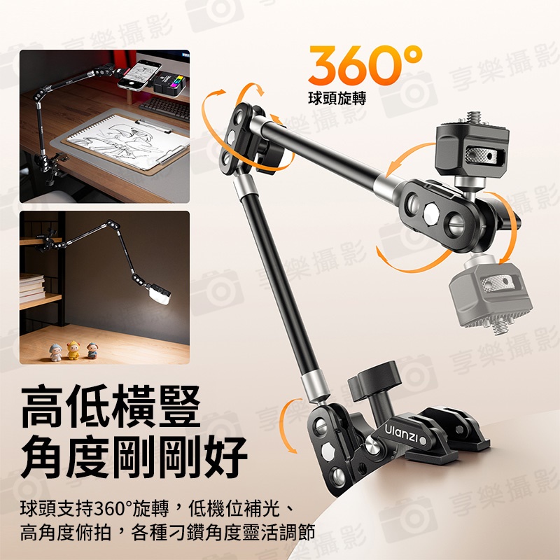 球頭支持360°旋轉,低機位補光、高角度俯拍,各種刁鑽角度靈活調節