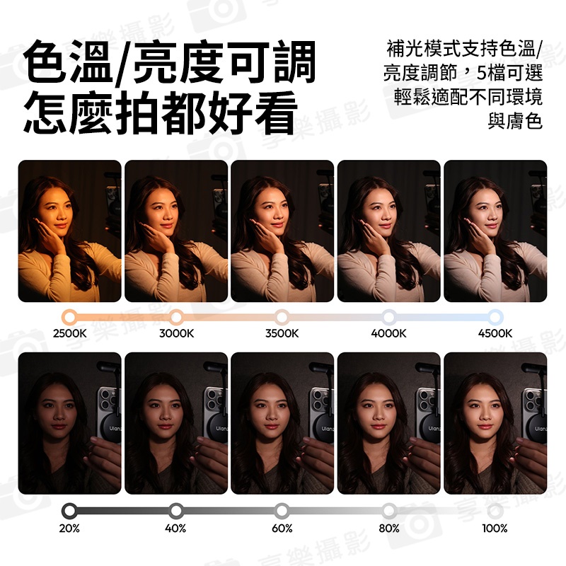補光模式支持色溫、亮度調節,5檔可選,輕鬆適配不同環境與膚色