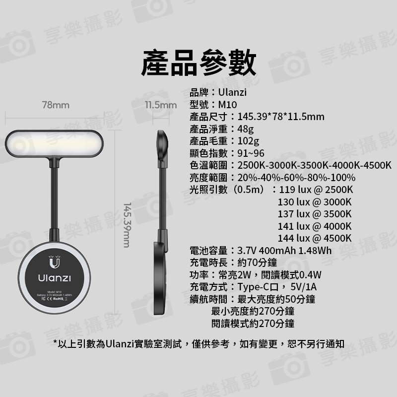 *以上引數為Ulanzi實驗室測試,僅供參考,如有變更,恕不另行通知
