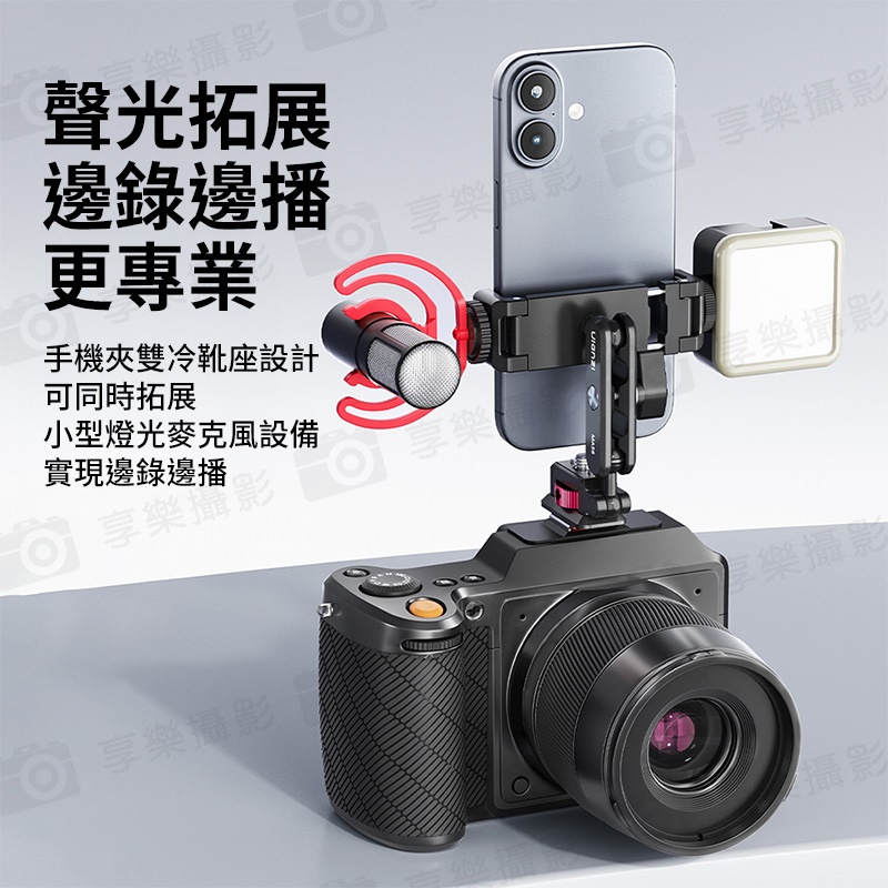 手機夾雙冷靴座設計,可同時拓展小型燈光、麥克風設備,實現邊錄邊播