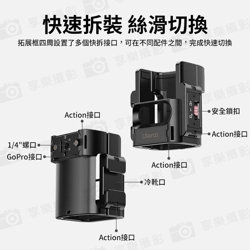 拓展框四周設置了多個快拆接口,可在不同配件之間,完成快速切換