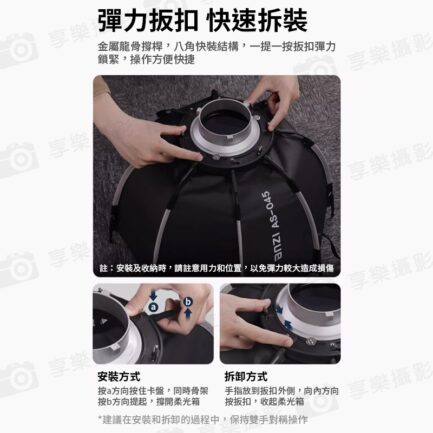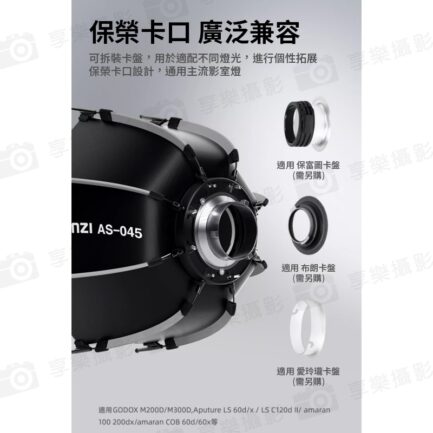 可拆裝卡盤,用於適配不同燈光,進行個性拓展,保榮卡口設計,通用主流影室燈