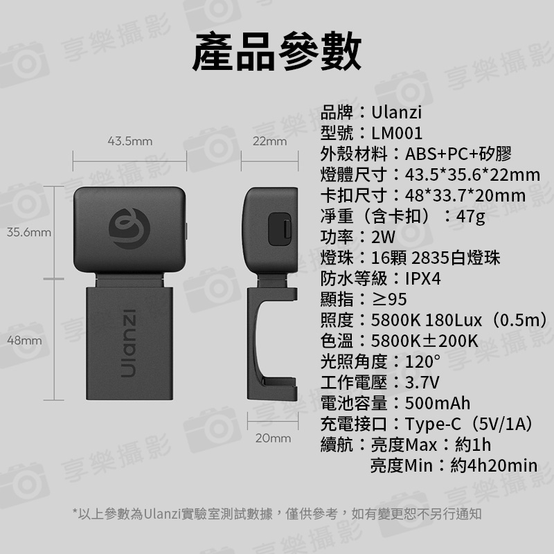 *以上參數為Ulanzi實驗室測試數據,僅供參考,如有變更恕不另行通知