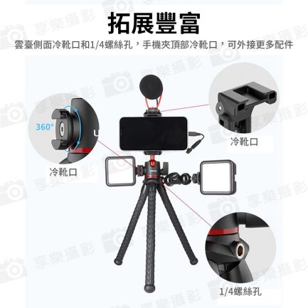 雲臺側面冷靴口和1/4螺絲孔,手機夾頂部冷靴口,可外接更多配件