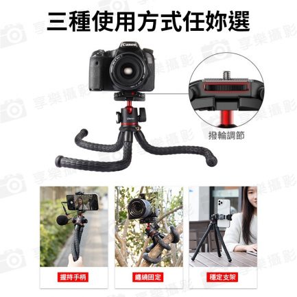 一體隱藏式手機夾設計,展開為通用手機夾,收納可直接安裝相機
