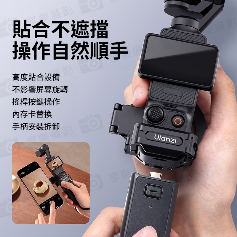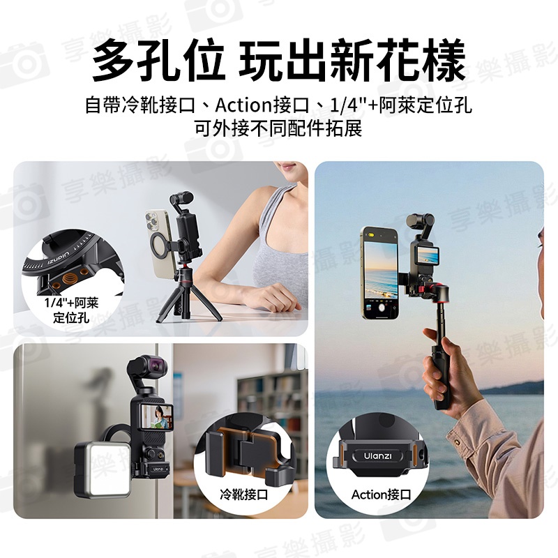 自帶冷靴接口、Action接口、1/4″ 阿萊定位孔,可外接不同配件拓展