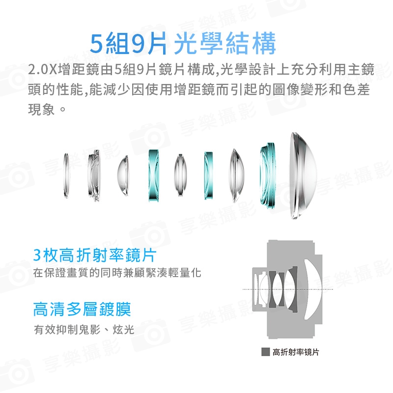 結構方面,這款增距鏡採用5組9片光學結構,內建3枚高折射率鏡片,
