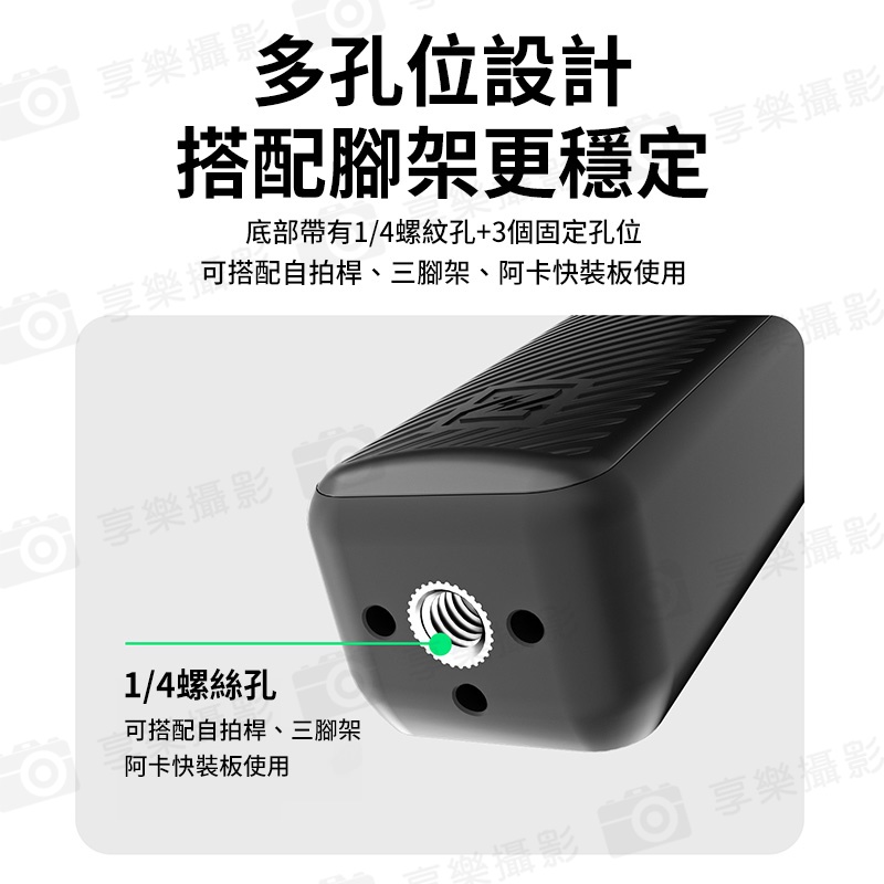 底部帶有1/4螺紋孔 3個固定孔位,可搭配自拍桿、三腳架、阿卡快裝板使用