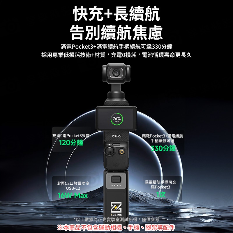 滿電Pocket3加滿電續航手柄續航可達330分鐘,採用專業低損耗技術、材質,充電0損耗,電池循環壽命更長久
